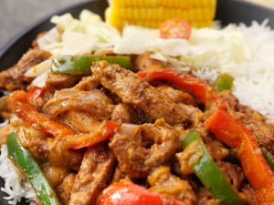 -Serving bowl mein boiled rice,tayyar fajita chicken,tayyar tomato sauce,iceberg,corn cob,lemon wedges & cherry tomato ka saath serve karein!
