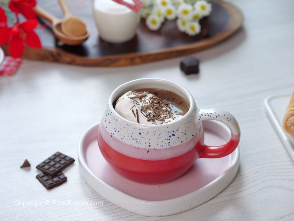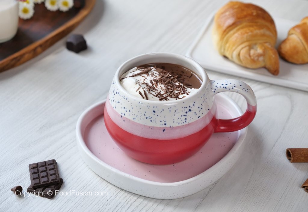 -Serving cup mein hot chocolate,whipped cream aur chocolate shavings dal ker serve karein!
