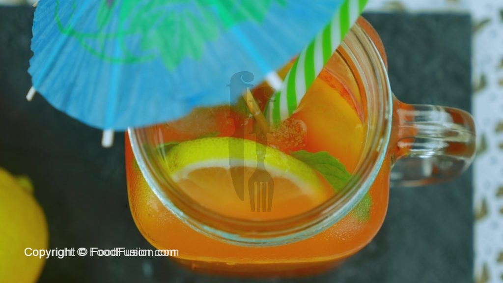 Serving glass mein peach aur lemon slices,peach mixture,thanda pani aur lemon juice dal dein.