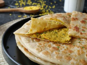 -Heat griddle,place rolled paratha & cook from both sides with ghee until golden & crispy.