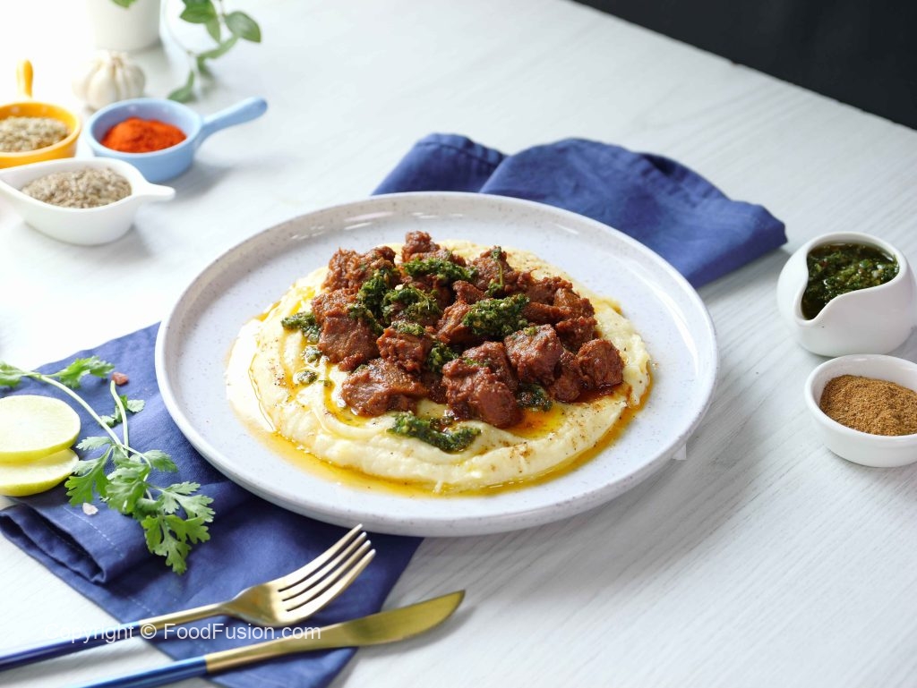 Fry beef boti paired with mashed potato and a bold chimichurri kick — flavor that hits every note. A comfort plate with a twist. #happycookingtoyou #foodfusion #araywahh