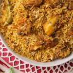 -Add mint leaves,fresh coriander,green chillies,boiled rice,mint leaves,fresh coriander,green chillies, fried onion,orange food color & desi ghee,cover with kitchen cloth & lid and steam cook on low flame for 10-12 minutes.