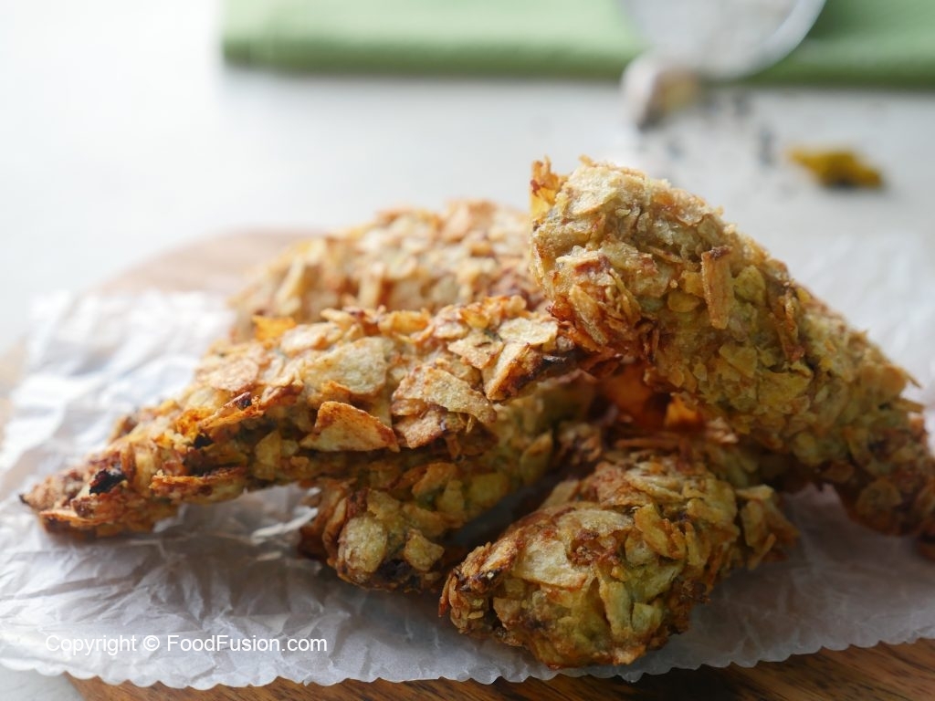 Now coat marinated chicken strips in all-purpose flour then dip into beaten eggs and coat with crush chips.
