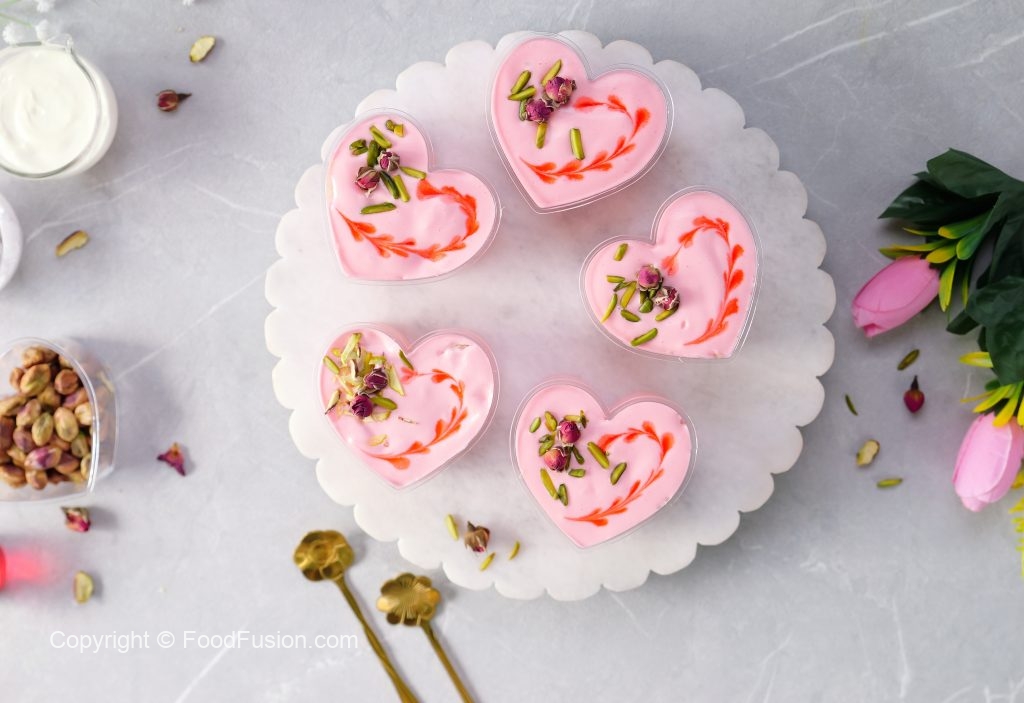 -In a serving cup,add prepared rose cream,pistachios,almonds,syrup coated pheni & spread evenly then add prepared rose cream & garnish with rose syrup,pistachios & dried rose buds (makes 8-9).