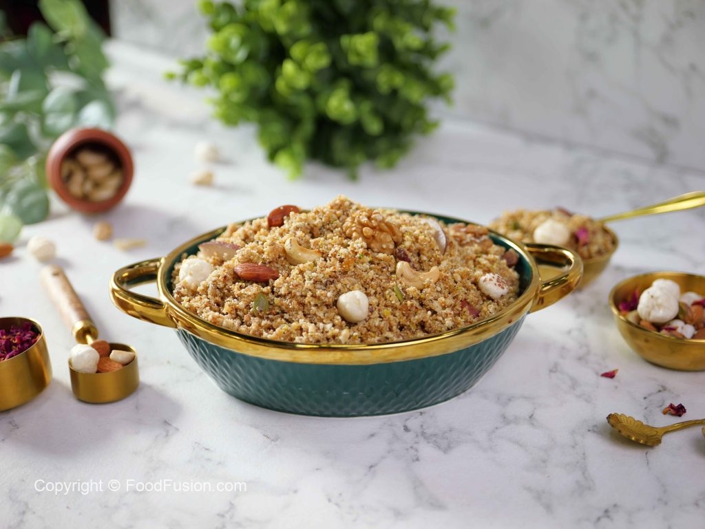-Chopper mein roasted lotus seeds aur fried edible gum add karein, coarsely chop kar ke bowl me transfer karein.