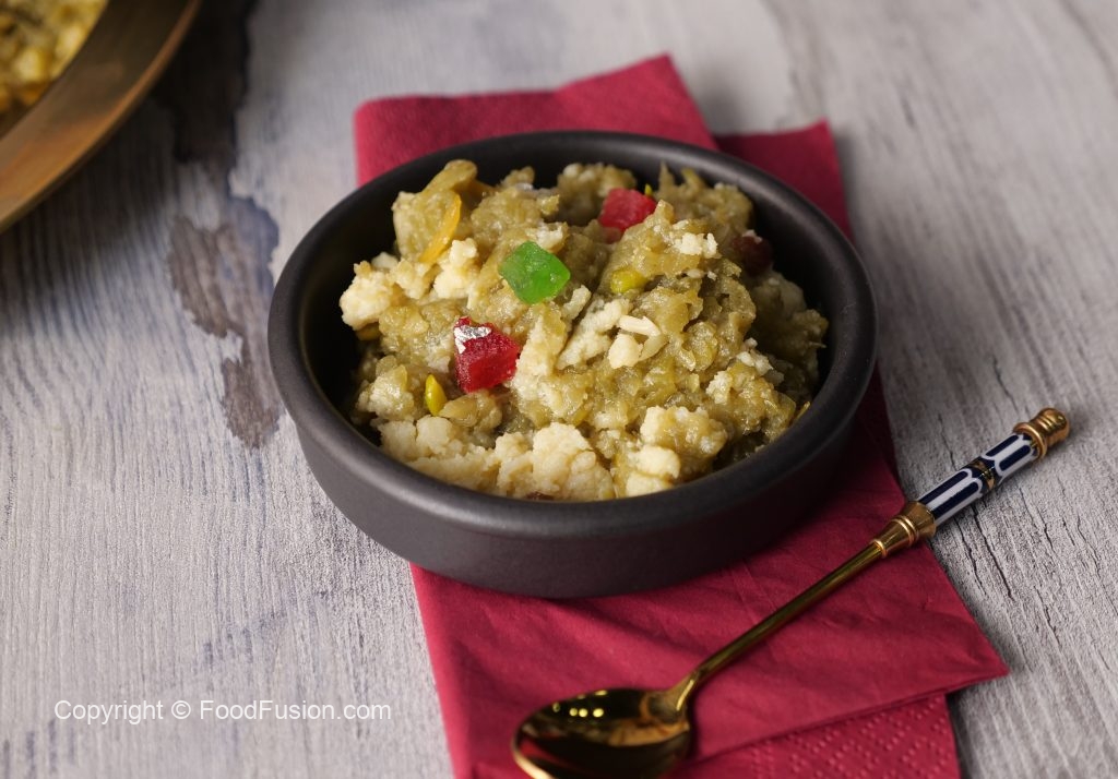 In a wok add grated bottle gourd & cook on low to medium flame until bottle gourds release water & then completely dried (approx. 25-30 minutes).