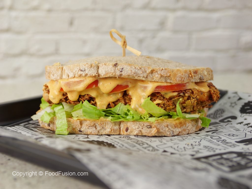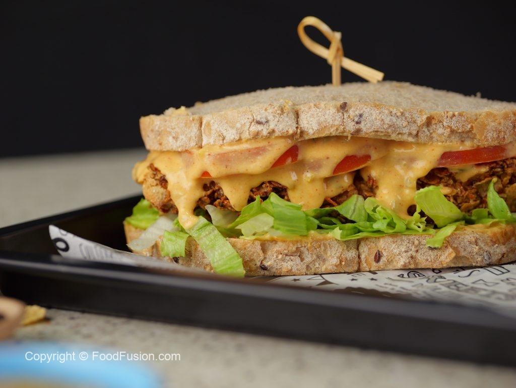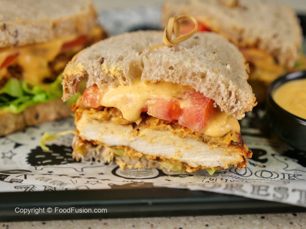 -On a multigrain bread slice,add & spread prepared special sauce,add iceberg,crispy chicken fillet,tomato slices,prepared sauce & cover with another slice to make a sandwich.