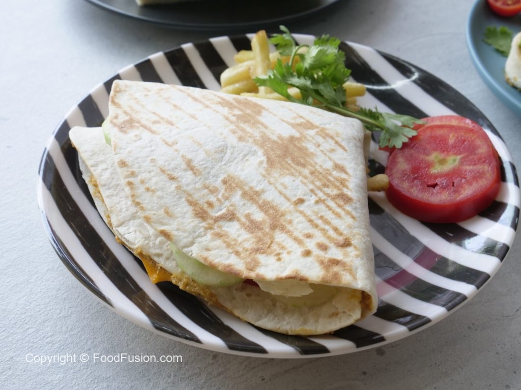 Cut one side of tortilla,add & spread chicken tikka spread,cheese slice,cucumber,tomato, potato fries and drizzle tomato ketchup,fold and grill for a minute & serve!