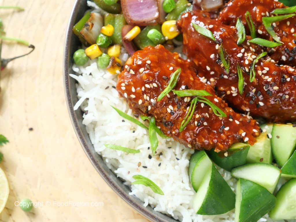 Sweet meets spicy in this Honey Sriracha Crispy Chicken Rice Bowl. A perfect blend of crispy chicken, tender rice, and a kick of fiery flavors. Dive into the deliciousness! #happycookingtoyou #foodfusion #araywahh