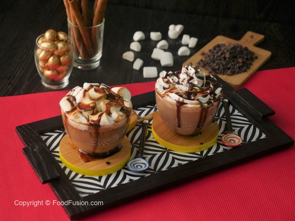 Serving cup mein nutella hot chocolate,whipped cream,chocolate chips,chocolate syrup aur cocoa powder dal ker serve karein.