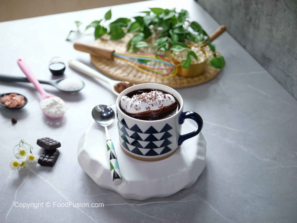 -Take out from oven,pour prepared hot chocolate,add whipped cream & garnish with grated dark chocolate & serve!