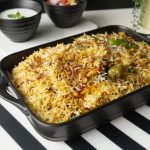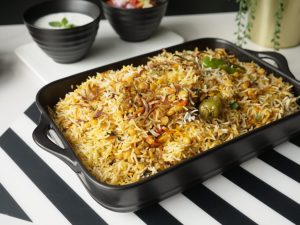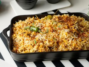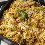 Add fried onion,boiled rice,fried onion,fresh coriander,mint leaves,green chilli,orange food color,kewra water and ghee,cover & steam cook on low flame for 8-10 minutes.