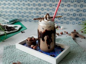 Serving glass mein chocolate syrup,ice cubes aur tayyar nutella iced coffee dal dein,whipped cream aur cocoa powder sprinkle ker ka serve karein.
