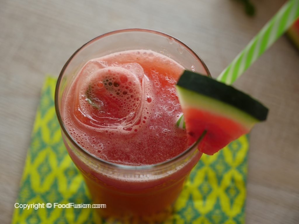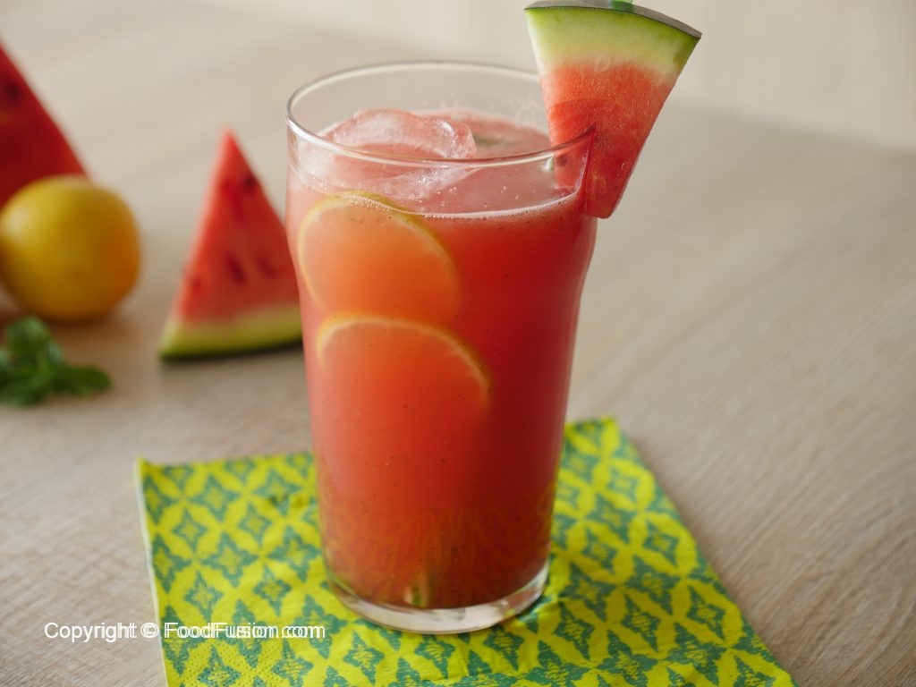 In blender,add watermelon,ice cubes,prepared lemon green tea,lemon juice,honey,mint leaves and blend well.