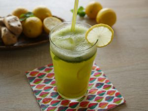 In blender,add ice cubes,lemon juice,prepared lemon green tea,honey,ginger,mint leaves and blend well.