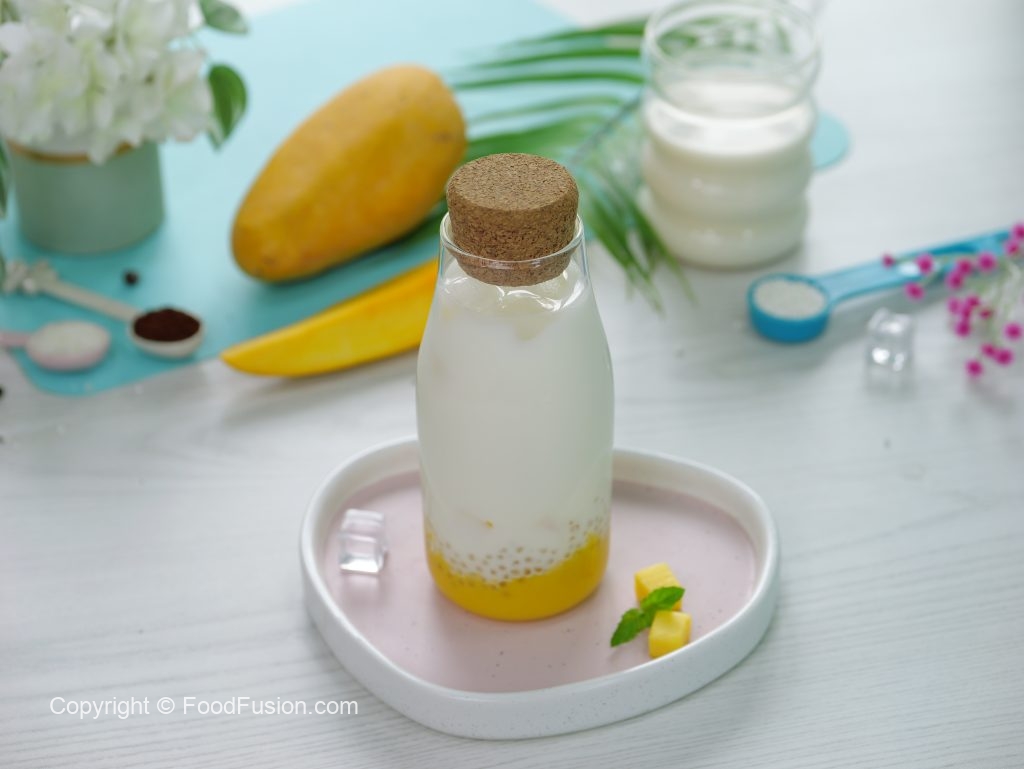 -Glass bottle mein tayyar mango puree (2-3 tbs),boiled sagudana (2 tbs),condensed milk mango chunks,ice cubes aur doodh dal ker stir ker lein & serve karein!