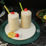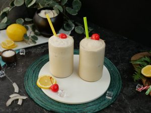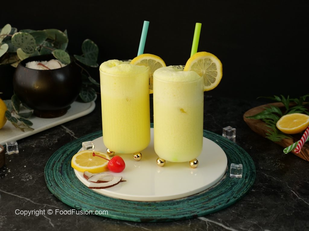 -In a shaker,add crushed ice,prepared lemon sugar syrup (3-4 tbs),coconut milk,close the lid and shake well.