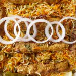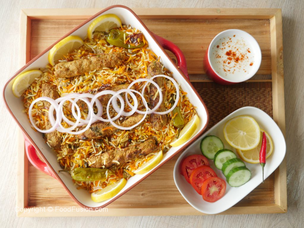 Ab dissolve zarda ka rang,fried pyaz aur cooked seekh kabab dal dein.