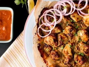 -In a bowl,add mutton chops,mutton mixed boti,pink salt,red chilli powder,garam masala powder, coriander powder,turmeric powder,cumin seeds,ginger garlic paste,lemon juice & mix well,cover & marinate for 1-2 hours.