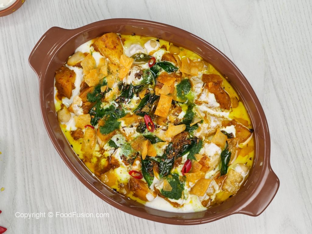 -Serving dish mein phulkiyan,tayyar dahi mixture,tayyar khattay aloo,dahi mixture,green chutney,tayyar tarka aur papri dal ker serve karein!