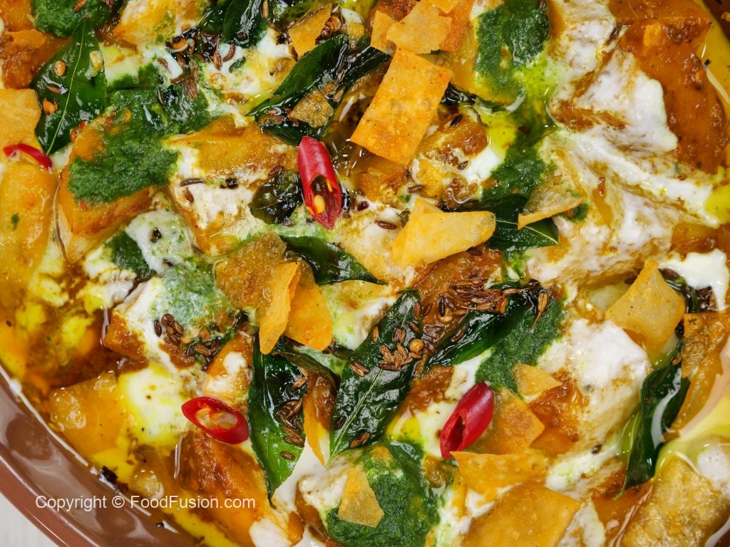 -In a serving dish,add phulkiyan,prepared dahi mixture,prepared khattay aloo,dahi mixture,green chutney,prepared tarka,papri & serve!