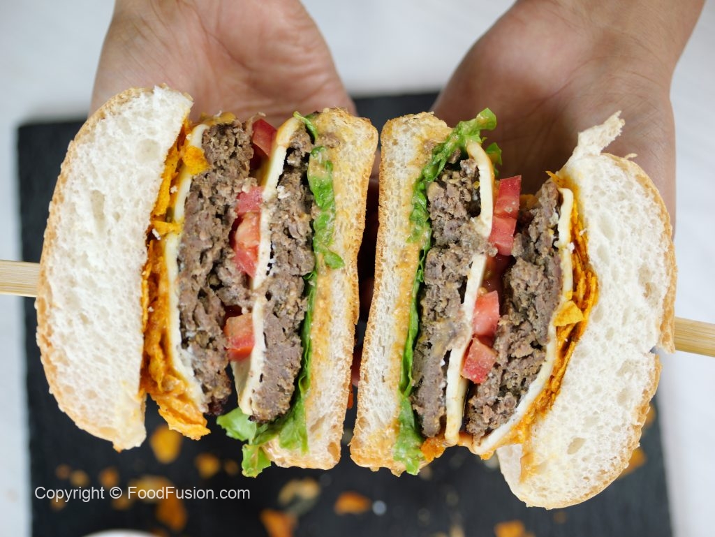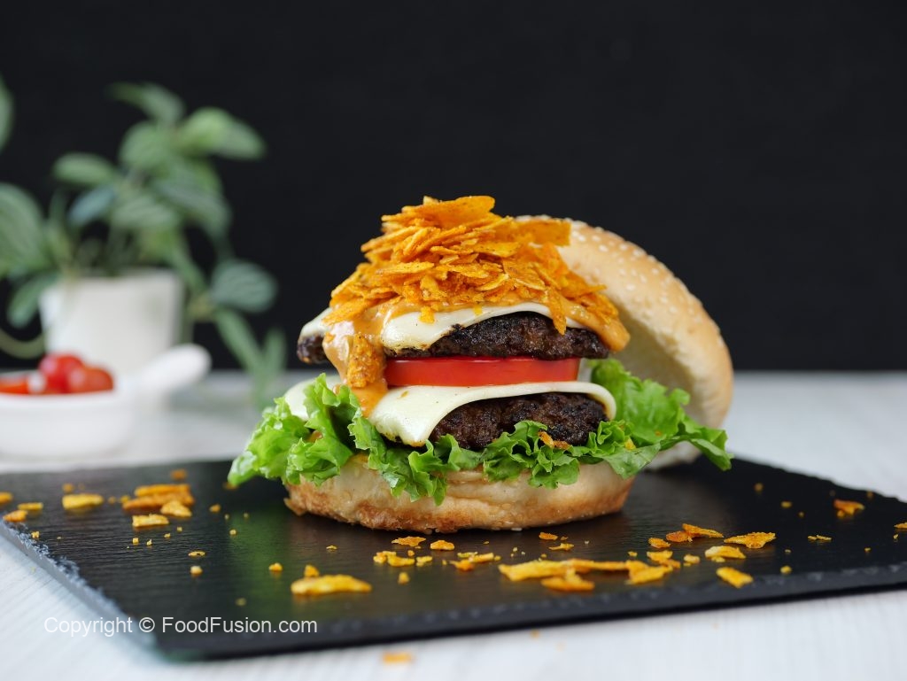 -On a burger bun,add & spread prepared fusion burger sauce,add salad leaves,burger patty with cheese, tomato slice,burger patty with cheese,fusion burger sauce,spicy chips (coarsely crush with hands) & serve with french fries (makes 3 burgers).