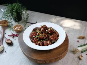 -In a wok,add garlic,ginger,tomato ketchup,soy sauce,vinegar,water,cornsyrup,brown sugar,red chilli powder,salt & red chilli crushed.