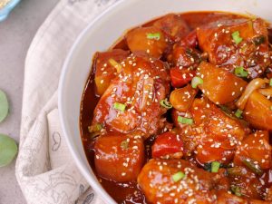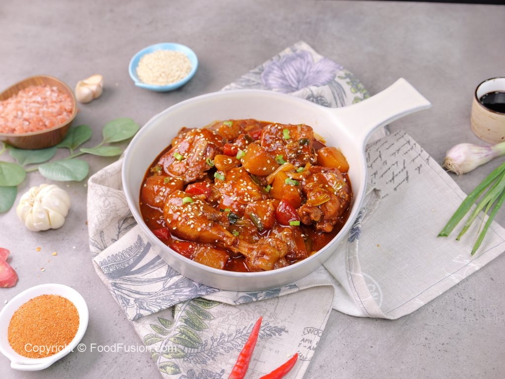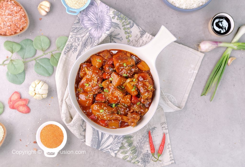 In a bowl,add gochujang paste,soy sauce,hot sauce,oyster sauce,garlic,sugar,red chilli crushed, chicken powder,water,whisk well & set aside.
