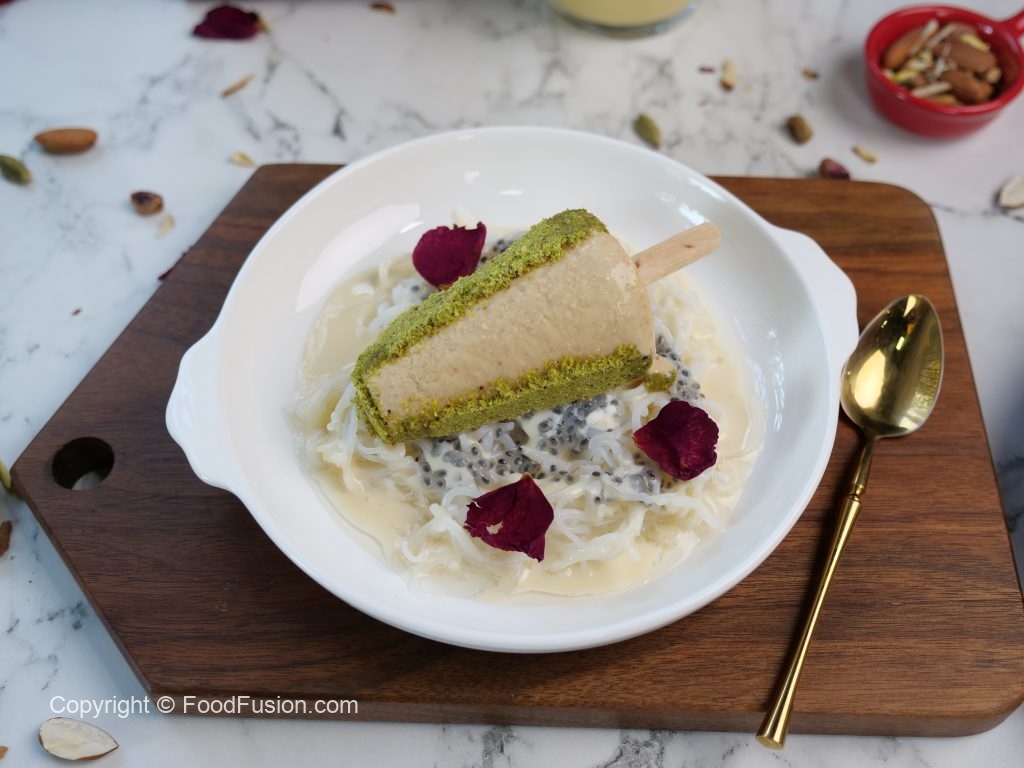 -On a serving plate,add falooda sawaiyan,soaked basil seeds,evaporated milk,kulfi & serve!