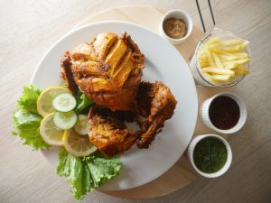 In wok,heat oil and deep fry whole chicken until golden brown.