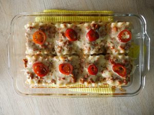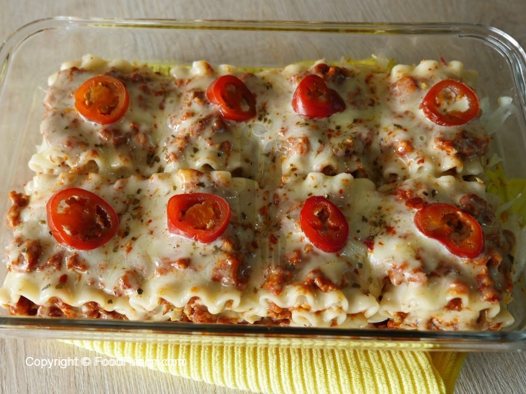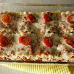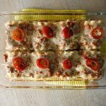 Baking dish mein red sauce with mince dal ker pheela lein.