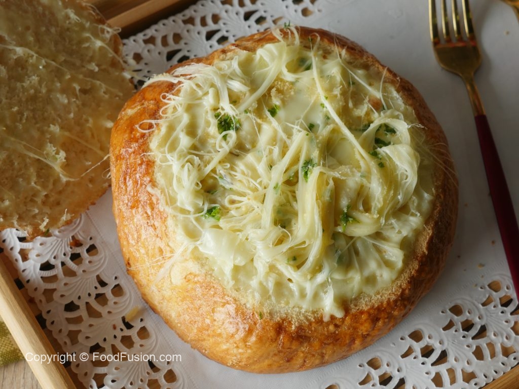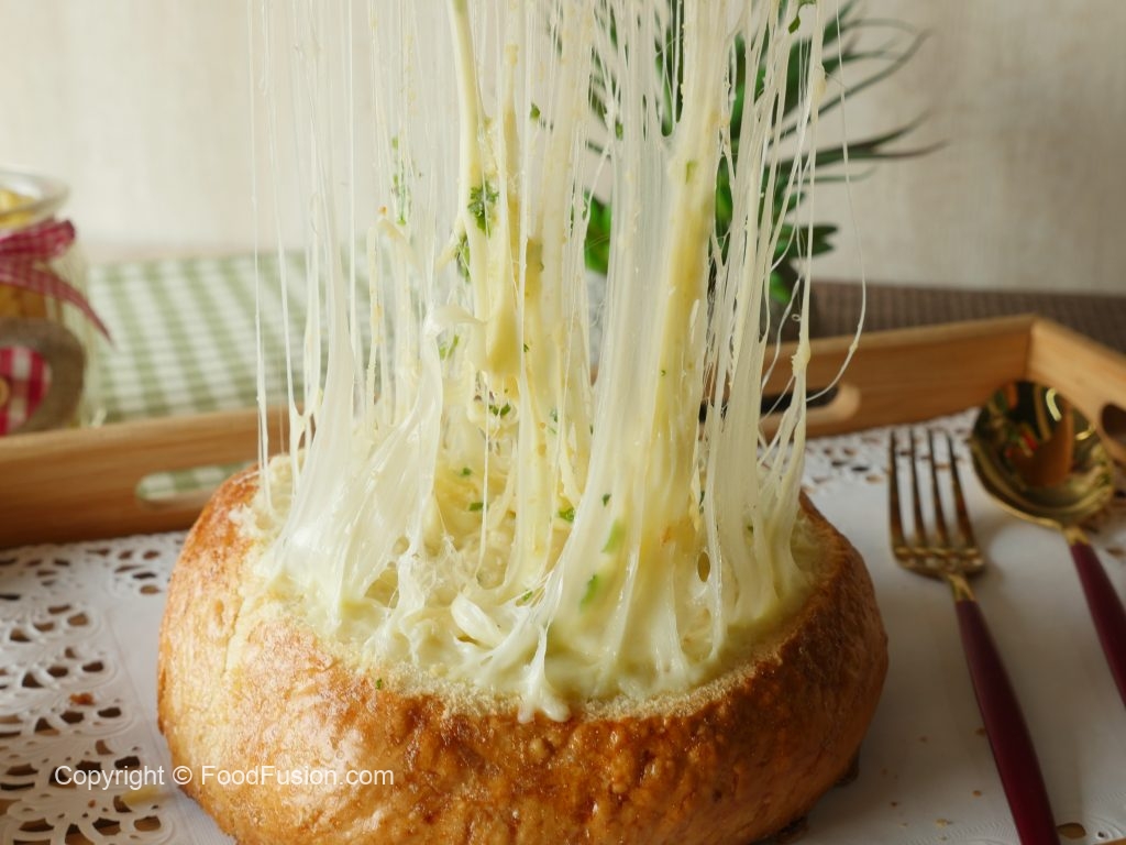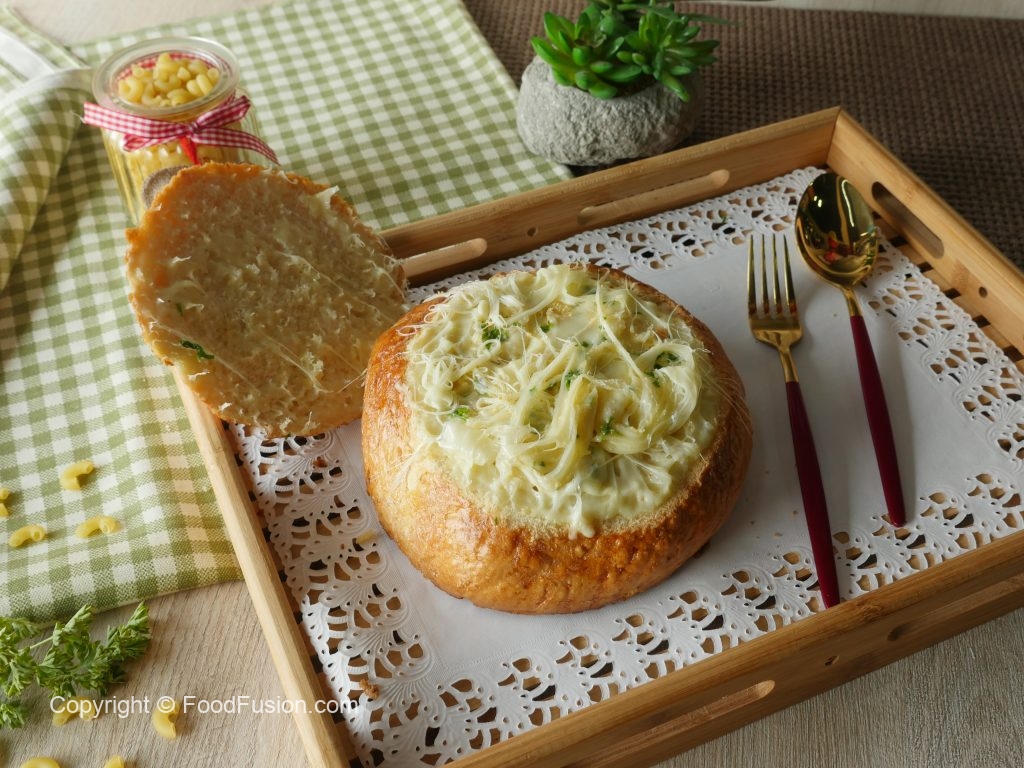 In bread bowl,add mac n cheese pasta,mozzarella cheese,parmesan cheese powder,fresh parsley and cover with top.