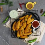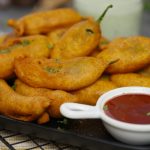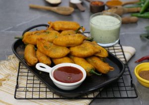 -Cut mirchi pakora from center and place them on a serving plate. Add green lentil gram in it.