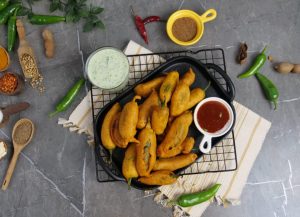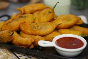 -Transfer prepared pakora mixture in a jug and dip stuffed green chillies in the batter.