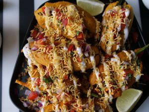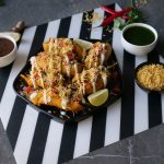 -Now add onion, tomatoes, fresh coriander, chaat masala, yogurt, nimco sev & red chilli crushed from top & serve!