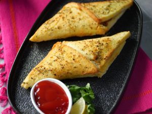 -Tayyar herb butter lagayein,rectangular shape mein fold karein,seal karein aur phir se herb butter lagayein.