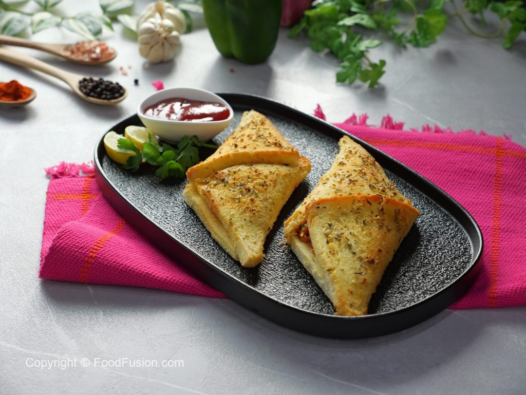 -Bread slices ke edges trim karein,dono slices ko halka pani laga kar overlap karein aur rolling pin se roll karein.