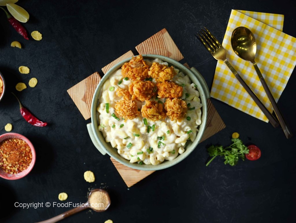 -Serving dish mein hara pyaz leaves aur popcorn chicken dal ker serve karein!