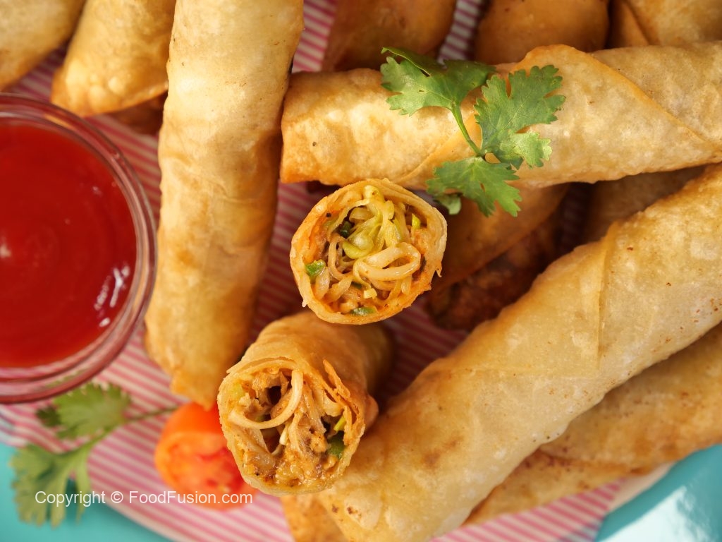 -Cut roll sheets diagonally,making a triangular shape,take one triangle sheet,add prepared filling,apply flour slurry,fold & roll up (makes 18-20).