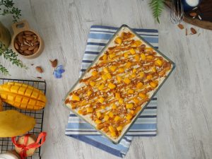 -Drizzle prepared butterscotch sauce,prepared almond crunch,mango chunks,prepared butterscotch whipped cream & spread evenly.