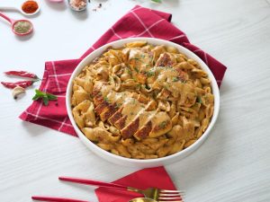 -Serving dish mein cooked pasta,spicy chicken fillet,pasta sauce aur fresh basil leaves dal kar serve karein!