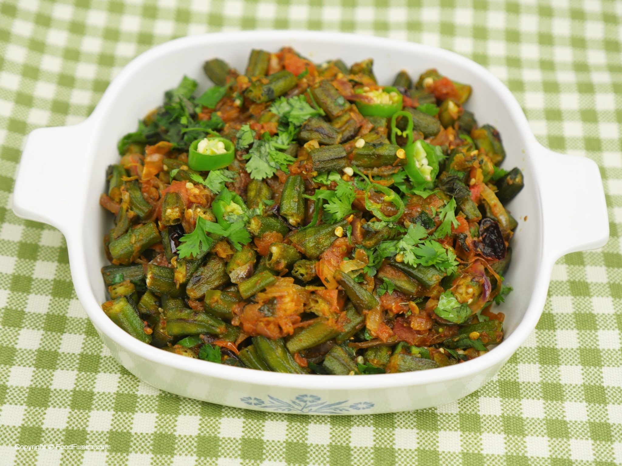 In pot,add oil,okra and fry for 4-5 minutes and set aside.