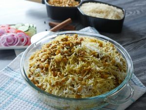 -Add orange food color,fried onion,cover with kitchen cloth & lid and steam cook on low flame for 10-12 minutes.