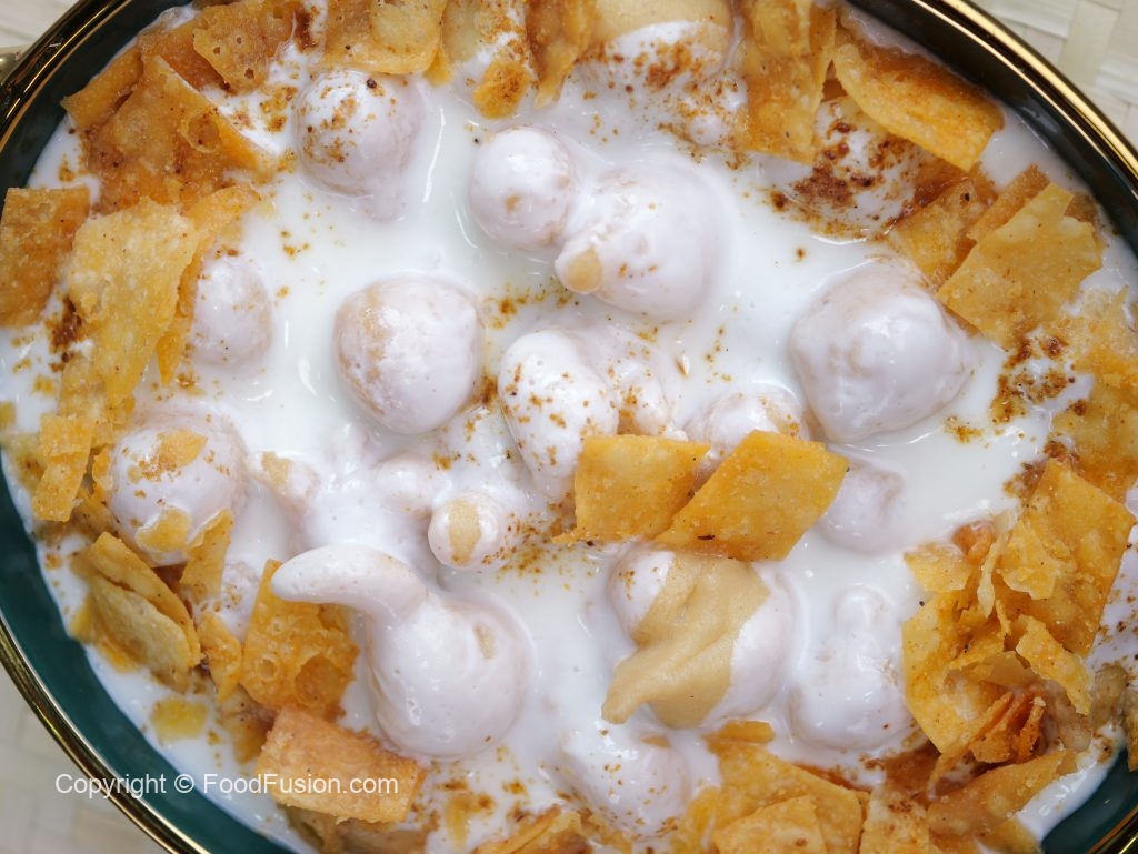 -In a serving dish,add soaked phulki,prepared meethi dahi,sprinkle chaat masala,garnish with papri & serve!