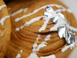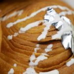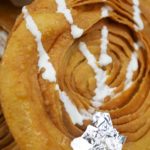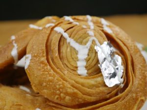 Cutter ki madad sa puri dough ko strips (about 1 inch) ki shakal mein cut ker lein aur swiss roll ki tarhan roll karein,dosri strip k upper roll rakh k phr sa swiss roll ki tarhan roll karein aur end ko stick ker dein,dry wheat flour mein coat ker lein.