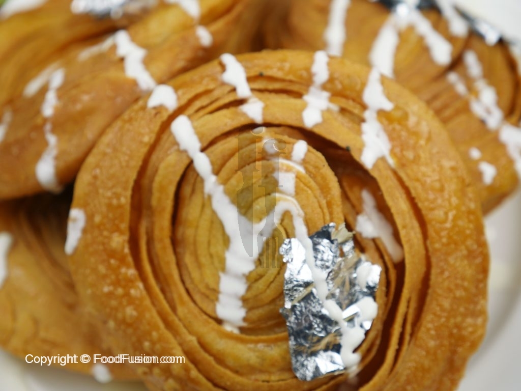 Spread desi ghee evenly over entire surface and dust flour,place another round dough, spread desi ghee and dust flour,repeat this process 2 times more.