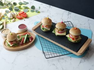 -Cut smini burger buns from center,add & spread prepared burger sauce,lettuce leaf,cheese slice,tomato slice,onion rings,fried chicken nugget,cucumber slices,tomato ketchup,burger sauce and top with another mini bun to make a burger (makes 8-10).