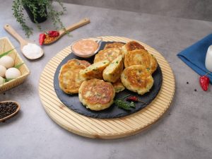 -In a frying pan,heat cooking oil,pipe out prepared mixture & flatten with the help of greased spoon & fry pancakes from both sides on low flame until golden brown.