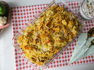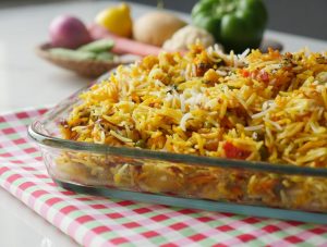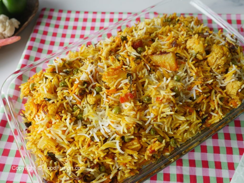 Add boiled rice,fried onion,cover and steam cook on low flame for 8-10 minutes & serve!