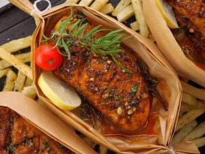 Extra thick parchment paper rakh ker marinated leg rakh dein aur dhak ker halki ancch per gul janay tak paka lein (1 hour).